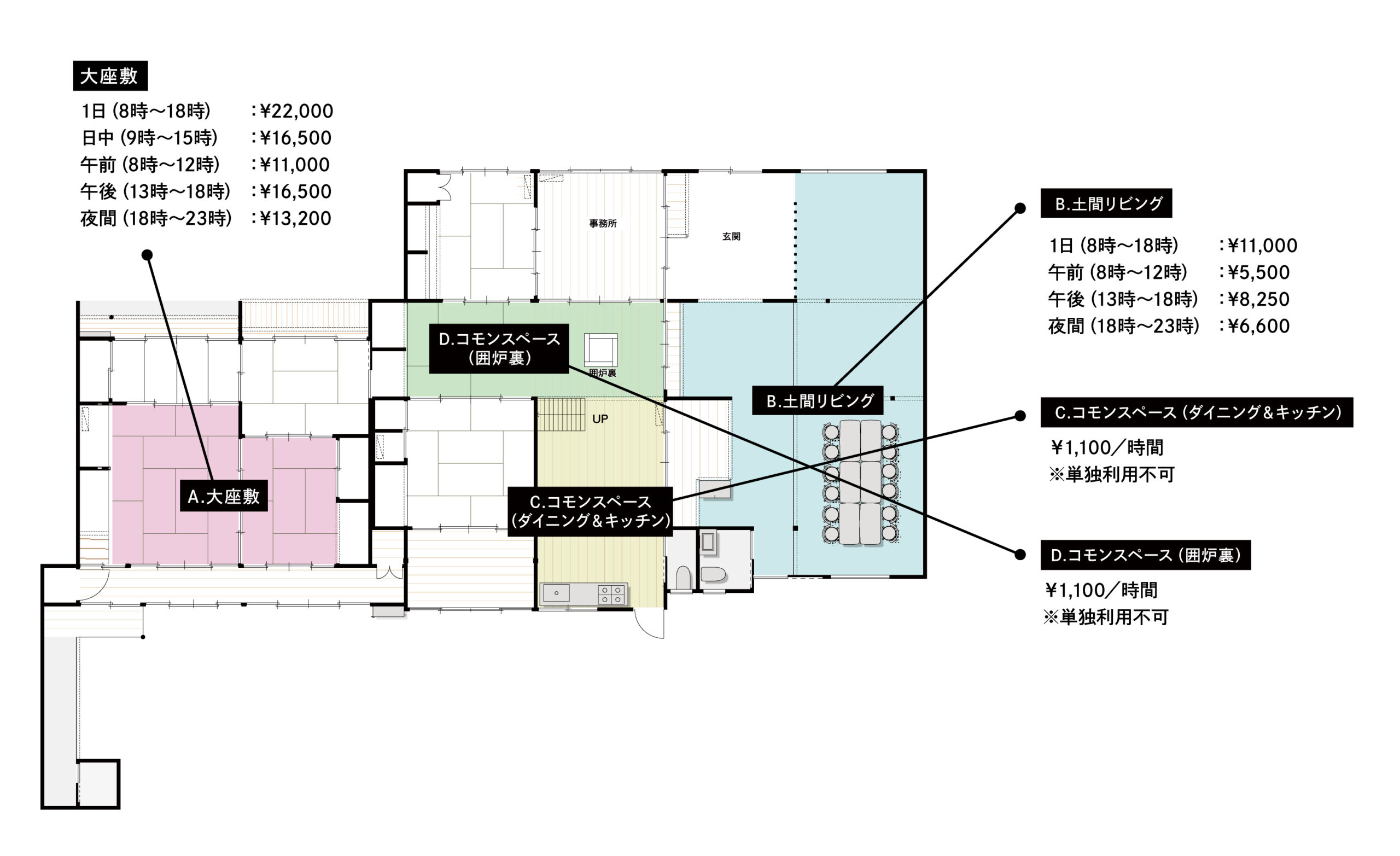 A.大座敷(日中) ¥16,500 C.ダイニング&キッチン 8:00〜16:00(8h) ¥8,800 (器、お膳レンタル別途)